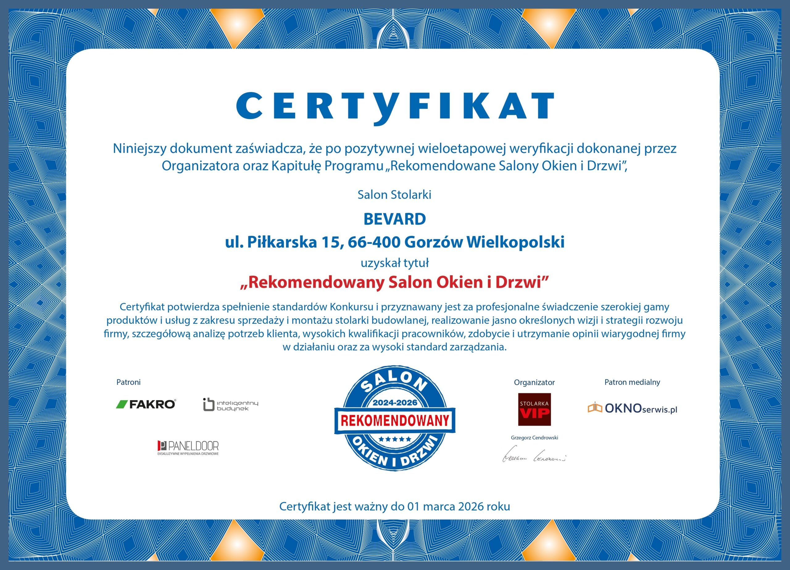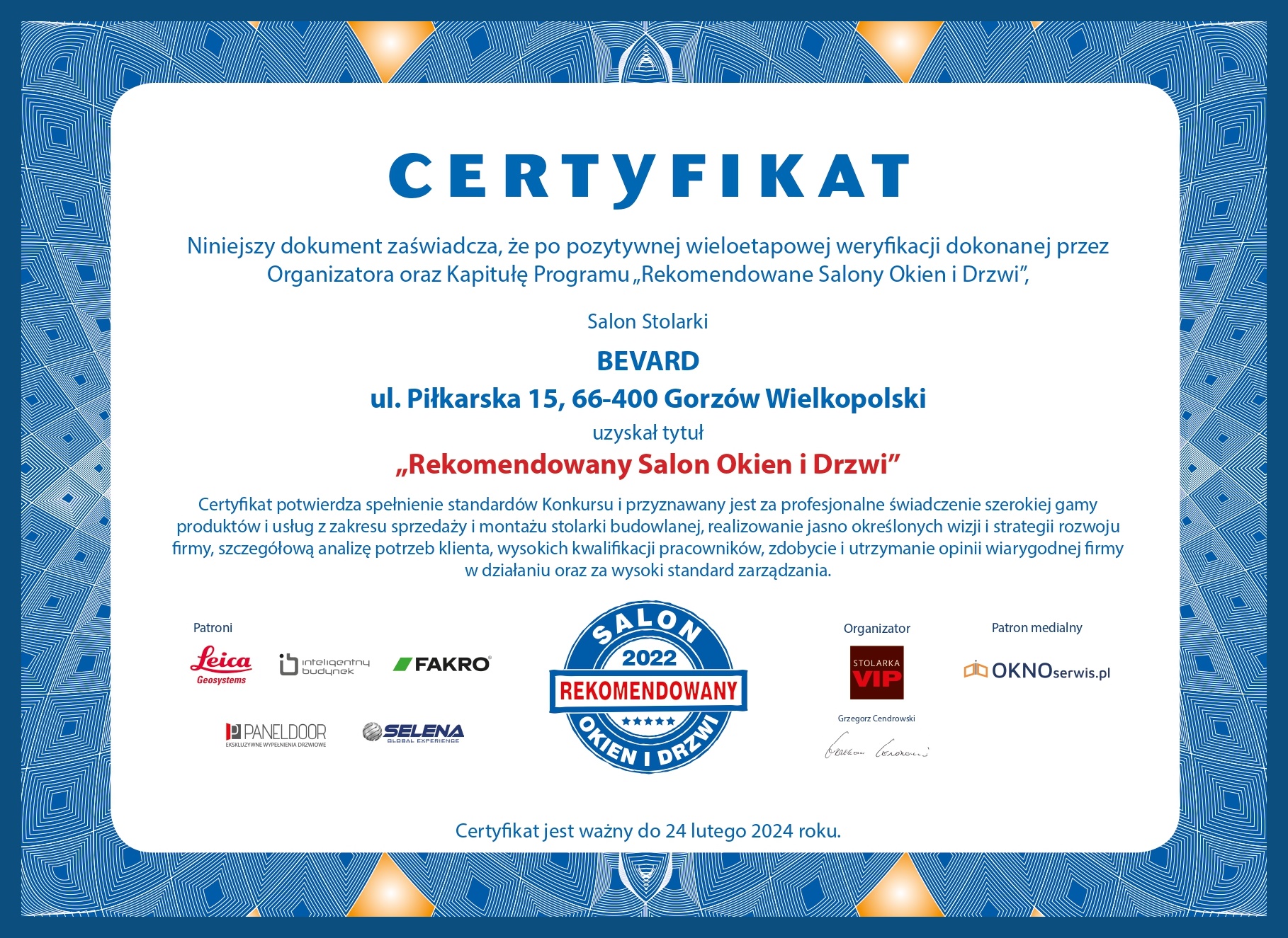 Salon okien, drzwi, bram i osłon Bevard przy ul. Piłkarskiej 15 w Gorzów Wielkopolskim otrzymał prestiżowe wyróżnienie i tytuł „Rekomendowany Salon Okien i Drzwi” 2022/2024. Przyznany znak jakości to bez wątpienia dowód na to, że firma spełnia określone wymogi kapituły. Tym samym dołączyła do grona najlepszych salonów w Polsce. Wybierając salon oznaczony logo Programu, Klient ma gwarancję, że po przekroczeniu jego progu wyjdzie z uśmiechem na twarzy i będzie miał pewność, że dokonał najlepszego wyboru.