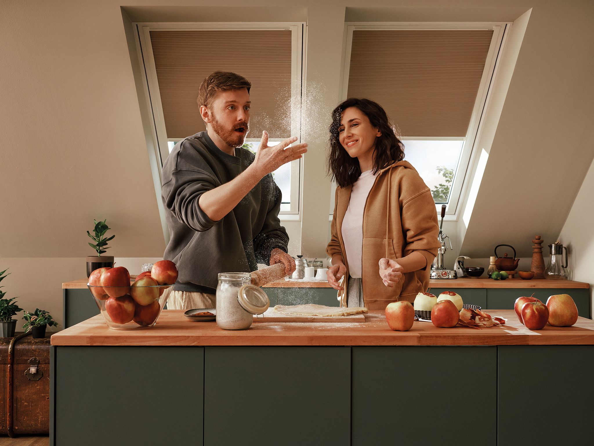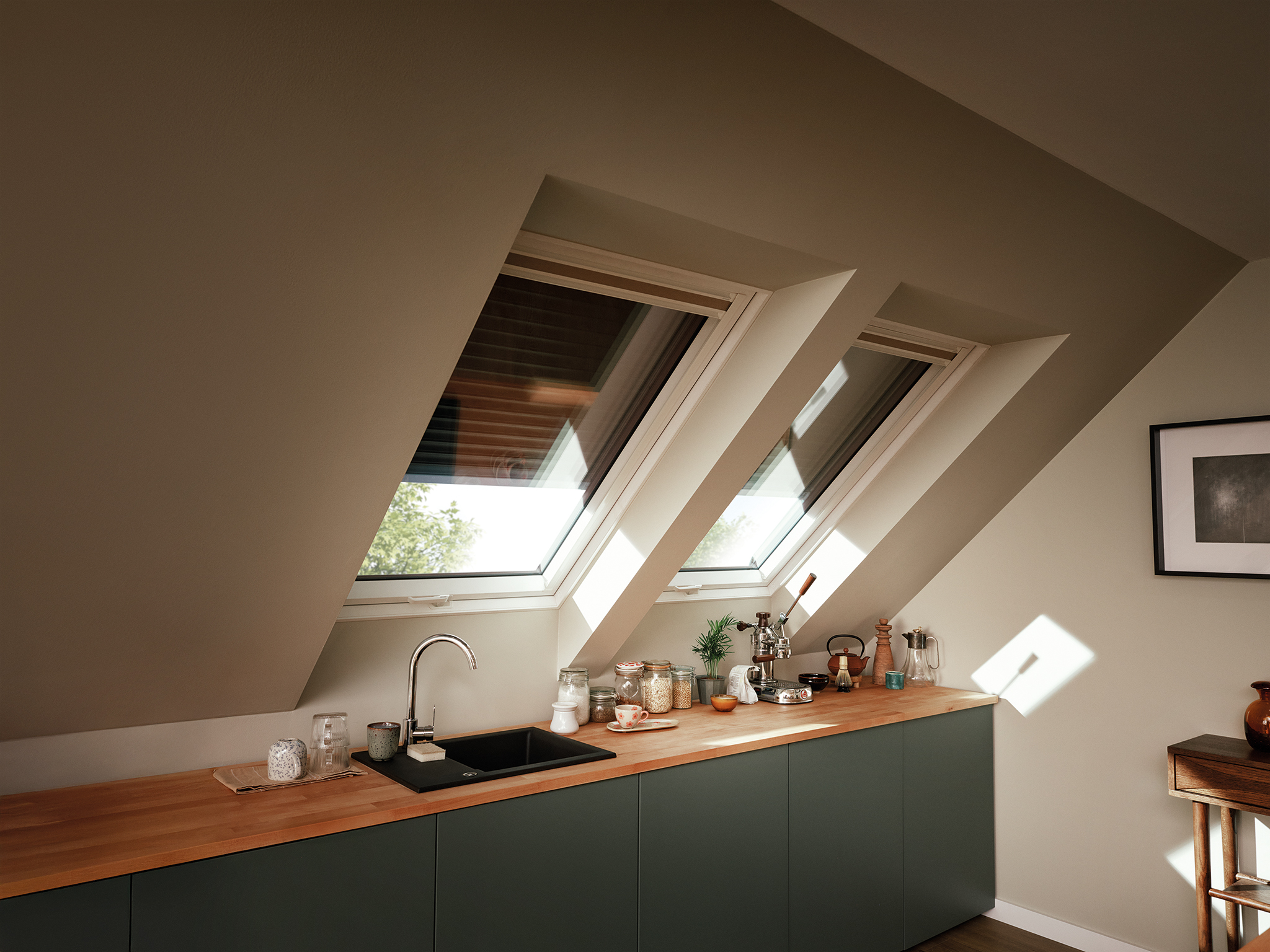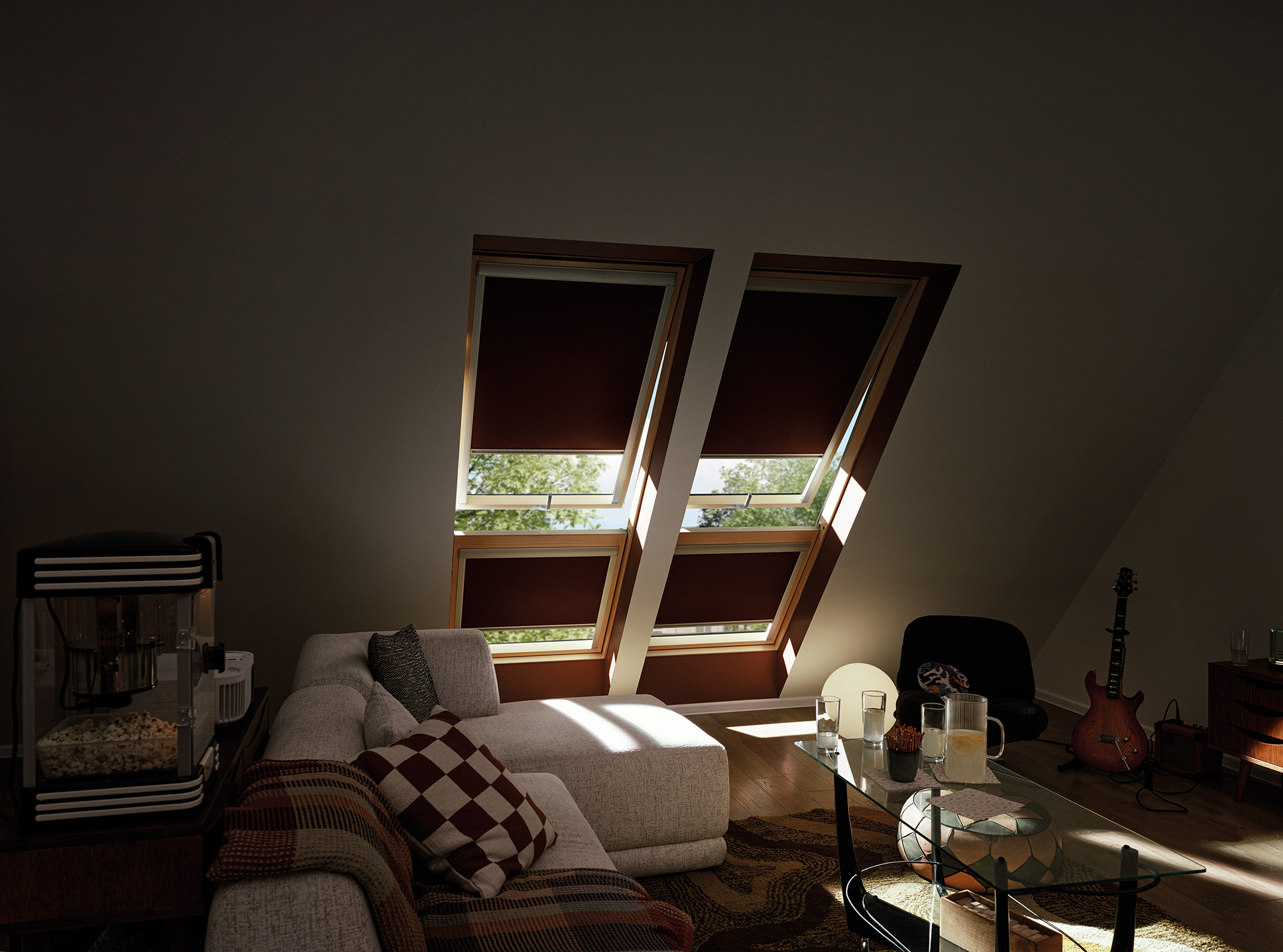 Okno dachowe GREENVIEW i roleta plisowana APF pozwalają precyzyjnie regulować światło, tworząc komfortową przestrzeń do wspólnych chwil.